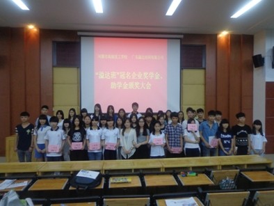 5月20日,广东溢达纺织有限公司企业代表在培训楼讲学厅举行“溢达”班冠名企业奖学金、助学金颁奖大会。
