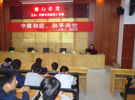 为加强学生思想道德教育,创建文明和谐的校园,11月18日晚,汽车维修教学部在培训楼讲学厅举行“中庸和谐,和平共处”人文素质大讲坛专题讲座。讲座由学生宿舍管理处朱燕青老师主讲,2014级汽车专业学生聆听了讲座。