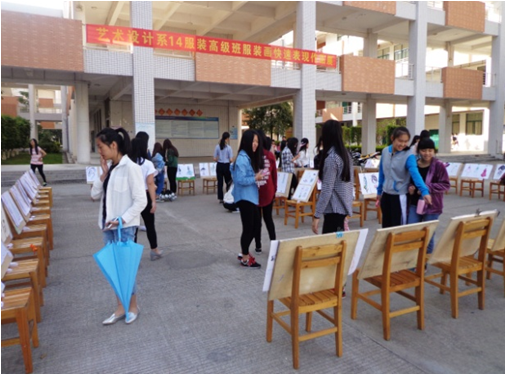 为进一步活跃校园艺术文化气氛,加强学生交流,展示艺术设计系优秀艺术底蕴。4月14日,艺术设计系在八号楼广场举办了14服装高级班服装画快速表现作品展。