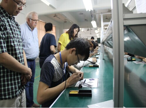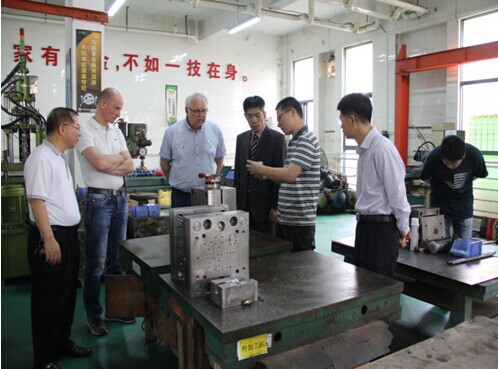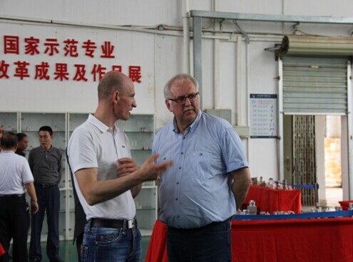 德国WL公司一行在梁秋生副院长的带领下,实地参观了我院太阳能光伏发电技术实训室、汽车实训室、数控加工中心等实训场所,梁秋生副院长向其详细介绍了我院各实训室场所设备、校企合作办学情况、学生学习成果作品等。德国教具专家Mr. Wiemann、Mr.Pollmer在认真参观了各实训室和学生作品后,对我校优美的校园环境、先进的实训设备、创新的学生作品大为赞赏,特别就校企合作如何开展、模具实训设备和成品展示进行了深入的探讨和交流。
