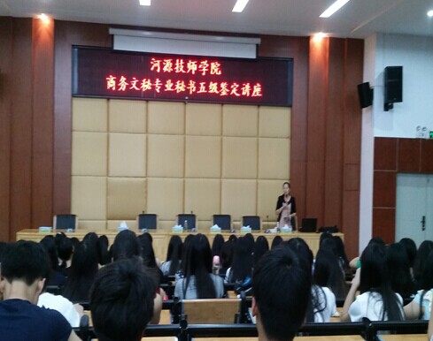 5月7日晚,我院在实训楼讲学厅举行“秘书五级鉴定指导”讲座。讲座由河职院人文学院文秘专业讲师张智老师主讲,学院文秘专业组全体教师及13、14级全体同学参加了本次讲座。
