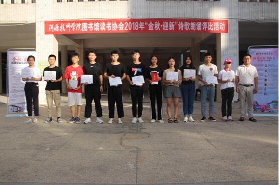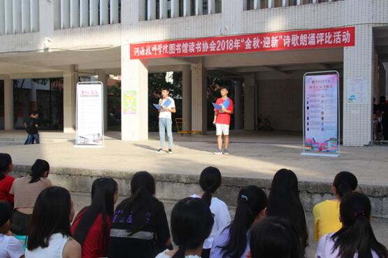 为丰富社团文化生活,提高同学们的朗读能力,2019年9月19日,图书馆读书协会在培训楼广场举办了“金秋·迎新”诗歌朗诵评比活动。