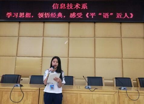 为了进一步提高广大青年学生的思想政治素质,掀起青年学生深入学习习近平总书记新时代中国特色社会主义思想的热潮,10月22日下午,信息技术系团总支率先组织团学干部集中观看了《百家讲坛》特别节目《平“语”近人——习近平总书记用典》之第八集《腹有诗书气自华》。学院团委骆晓红书记,信息技术系朱少威主任、黄丽娥副主任、巫骑伟副主任,以及系部团学会全体成员参加。