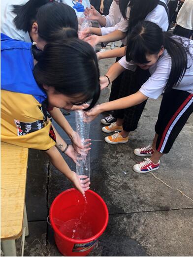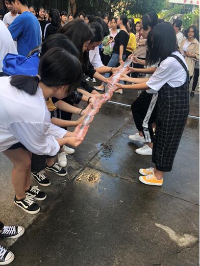 在温和的阳光下,活动现场挤满了参赛的选手。在明确比赛规则后,同学们开始正式比赛。同学们每八人为一组,用废弃矿泉水瓶做成的水槽进行递水,七人的水槽连成水渠递水,一人加水。递水的人只能用手扶住水管,在规定的一分钟内把水传到终点的空桶处,在规定的时间内传的水最多的组获胜。