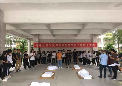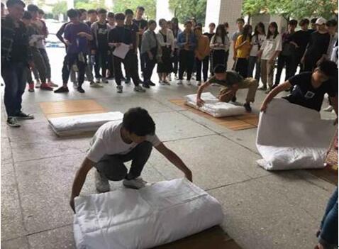 2018年11月12日下午,学院第九届宿舍文化节之叠被子大赛在培训楼广场顺利开展。比赛邀请生活老师担任评委,全院各寝室代表参加了此次比赛。