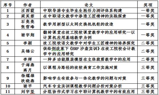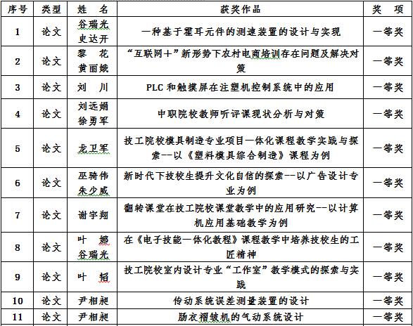 2018年《广东技工教育研究》优秀论文评选,共送评论文21篇,其中11篇获奖,一等奖4篇,二等奖3篇,三等奖4篇。(表4)