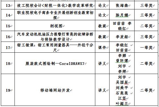 我院教师积极参加广东省职业培训和技工教育协会优秀教科研成果评选,我院有19个项目获奖,其中一等奖8个,二等奖8个,三等奖3个。(表6)