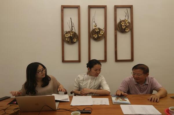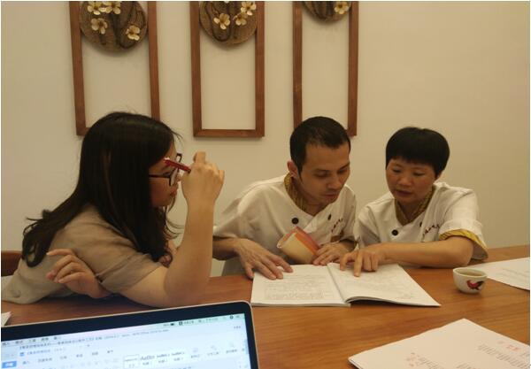 (图二)梁自敏老师与大埔小吃文化城的点心师傅校对教材
