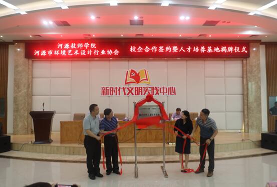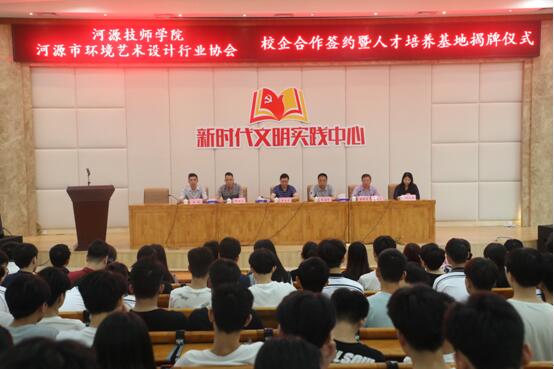 2019年4月26日上午,我院与河源市环境艺术设计行业协会校企合作签约暨人才培养基地揭牌仪式在图书馆报告厅举行。市人社局副局长罗文才,学院党委书记、院长张海锋,副院长梁秋生,河源市环境艺术设计协会的会长杨锐、执行会长繆国龙,秘书长何旭倩,市内外室内设计公司20多家代表,以及学院艺术设计系室内专业全体师生参加了仪式。仪式由学院副院长梁秋生主持。