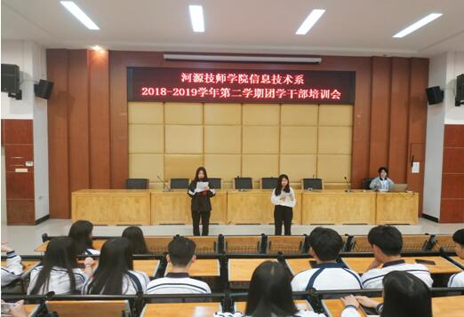 为加强信息技术系团学干部的沟通交流能力,全面提高团干的综合素质,信息技术系于2019年5月6日晚在培训楼讲学厅举办了2018-2019学年第二学期团学干部培训会。信息技术系副主任巫骑伟、李晓聪老师出席,信息技术系全体团学干部参加了培训。