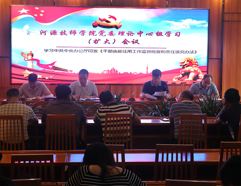 2019年5月29日上午,我院在一号楼大会议室召开理论中心组学习(扩大)会议,传达学习《干部选拨任用工作监督检查和责任追究办法》(以下简称《办法》)精神。学院党委会委员、各党支部书记、中层管理干部和各教学系正、副主任参加了会议。