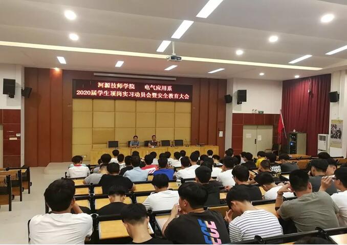 为了提高学生顶岗实习工作质量,指导学生做好顶岗实习的各项准备,2019年6月12日晚,电气应用系在培训楼讲学厅举行了学生顶岗实习动员会暨安全教育大会。会议由电气应用系主任张雪峰主持,副主任谷瑞光、各班主任及实习班级全体同学参加了会议。