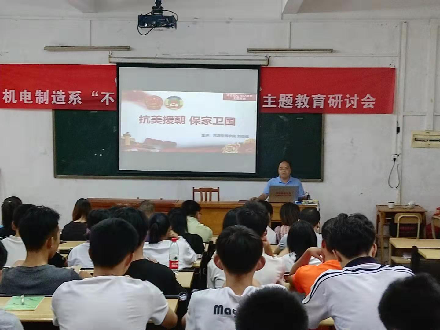 为进一步增强学院党员党性修养,学习抗美援朝中国人民志愿军坚守“抗美援朝,保家卫国”的初心和使命,在战争中不畏艰险、英勇顽强、不惧牺牲的高度爱国主义和革命英雄主义精神,2019年10月14日下午,学院副院长刘俊侃在8103课室为机电制造系党支部开展了“抗美援朝,保家卫国”主题党课。机械制造系全体党员师生参加了党课学习活动。党课由学院副院长刘俊侃主讲。