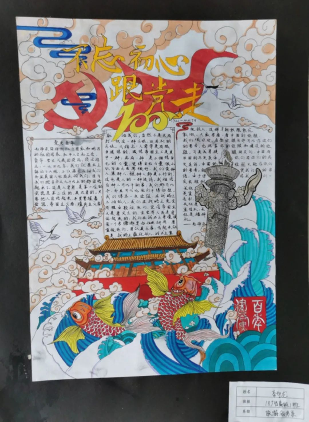 本次思政手抄报竞赛圆满举行不仅为学生们搭建一个展现自我的舞台,增进了同学们之间的交流,同时也丰富了同学们的课余生活,更是进一步展现了我院学子奋发向上永不放弃的青春风采。选手们在赛场上挥洒青春汗水,以拼搏竞争,永不言败的精神为建党100周年献上一份独特的礼物。