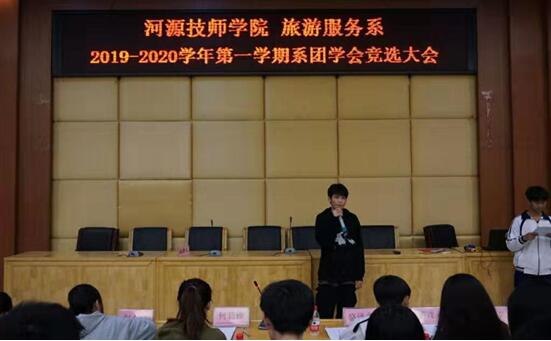 旅游服务系举行2019-2020学年第一学期团学会竞选2019年12月24日晚,旅游服务系团学会在培训楼c栋讲学厅举行了系部团学会竞选大会。旅游服务系团总支书记何莉雅,以及该系2018级团学会干部、2019级团学会全体人员共200余人参加了本次会议。 (图一)团学会副主席代表发言(图二...