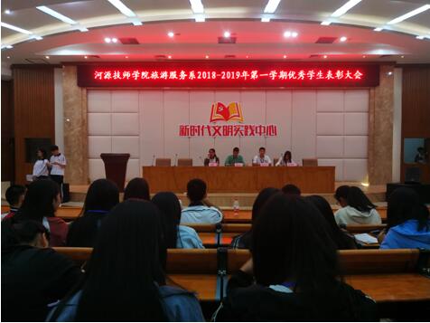 旅游服务系2018-2019年第一学期优秀学生表彰大会 为鼓励学生奋发图强,形成良好的学习氛围,2018年10月31日晚,旅游服务系在图书馆报告厅举办优秀学生表彰大会。旅游服务系主任谢龙桂老师、副主任陈伟宁老师、副主任罗丹老师、团总支书记曾晓君老师,以及旅游服务系全体同学...