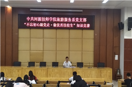 立斗志,扬青春!——中共河源技师学院旅游服务系党支部开展知识竞赛活动 为深入学习贯彻党的十九大精神,激励全系党员教师和学生深入学习领会习近平新时代中国特色社会思想。2018年6月13日晚,旅游服务系党支部在培训楼讲学厅举行了“不忘初心跟党走·做新时代优秀青年”党...