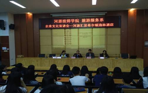 河源汇景希尔顿酒店到我院召开宣讲会为给2014级的准毕业生们提供更好的就业机会,进一步了解企业文化,2016年4月12日晚,旅游服务系在培训楼讲学厅举行河源汇景希尔顿逸林酒店企业文化宣讲会。希尔顿逸林酒店人力资源段景双总监、吴上清经理、旅游服务系谢龙桂主任、刘晓霞副主任以...
