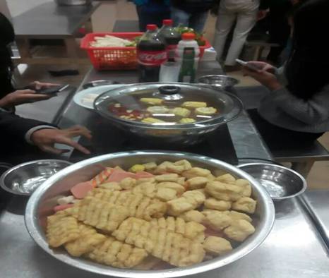 为了迎接冬至,传递欢乐与温暖,15烹饪2班于2015.12.22日晚在饭堂一楼组织了“师生齐聚一堂,迎接冬至”的活动。有同学在活动后表示:从购置原料到准备原料,以及搞卫生的过程中虽然比较麻烦、辛苦,但是看到老师和同学们满足的表情,心里很快乐,同时在买原料的过程中增长了知识,也对于策划活动方面有了很大的收获。