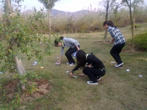 为弘扬雷锋精神,宣传志愿服务精神,普及志愿服务理念,积极培养志愿服务文化。2016年4月17日上午,2014级旅游1班的全体“留宿”学生,在学校饭堂后山进行清理生活垃圾,美化学校环境志愿服务活动,为美化校园环境,宣传环保贡献一份力量。