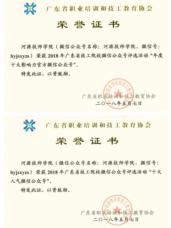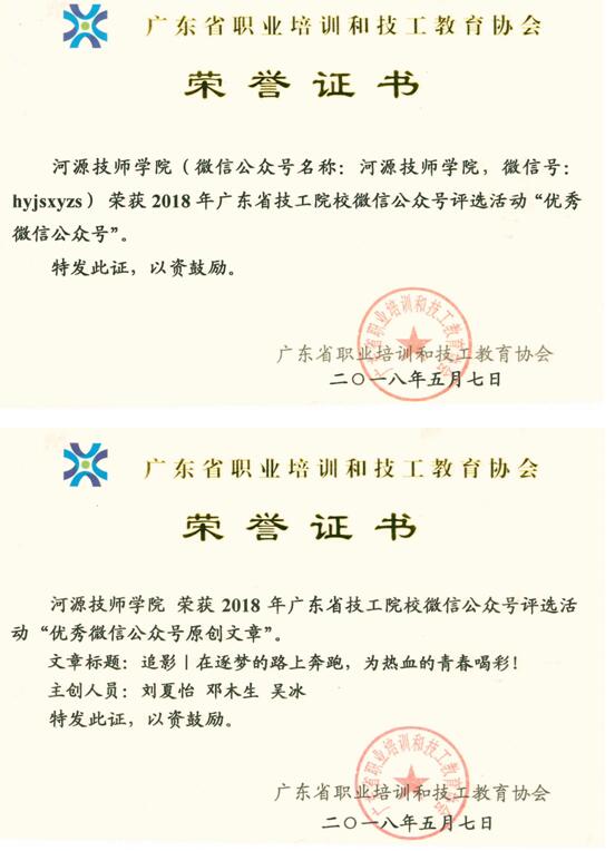 最终,我院官方微信公众号“河源技师学院(hyjsxyzs)”在本次评选中荣获“年度十大影响力官方微信公众号”、“ 十大人气微信公众号”、“优秀微信公众号”;公众号推送的《追影|在逐梦的路上奔跑,为热血的青春喝彩!》荣获“优秀微信公众号原创文章”;学院邓木生、吴冰老师被评为“优秀通讯员”。
